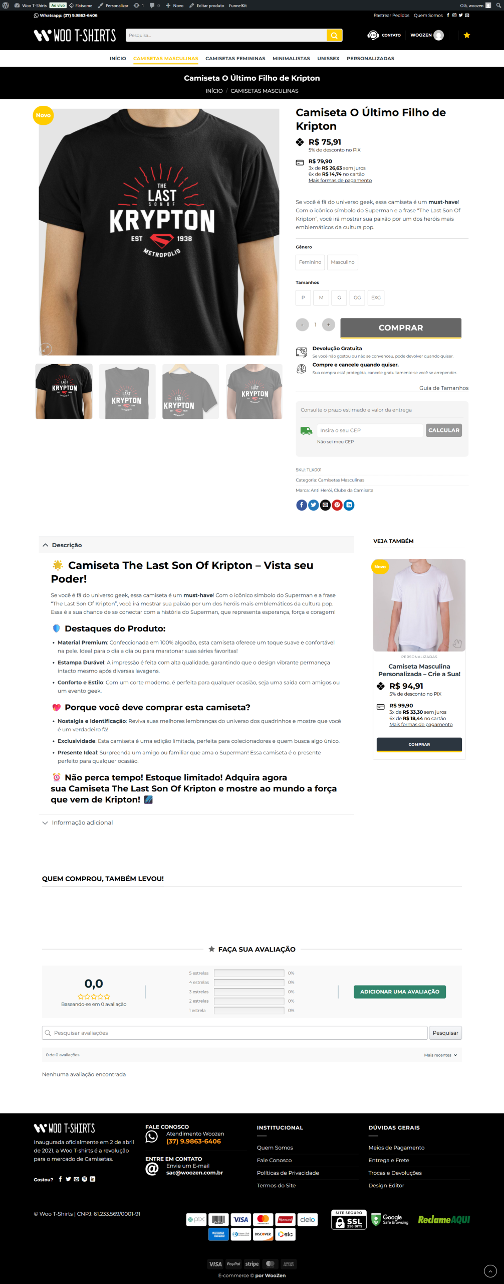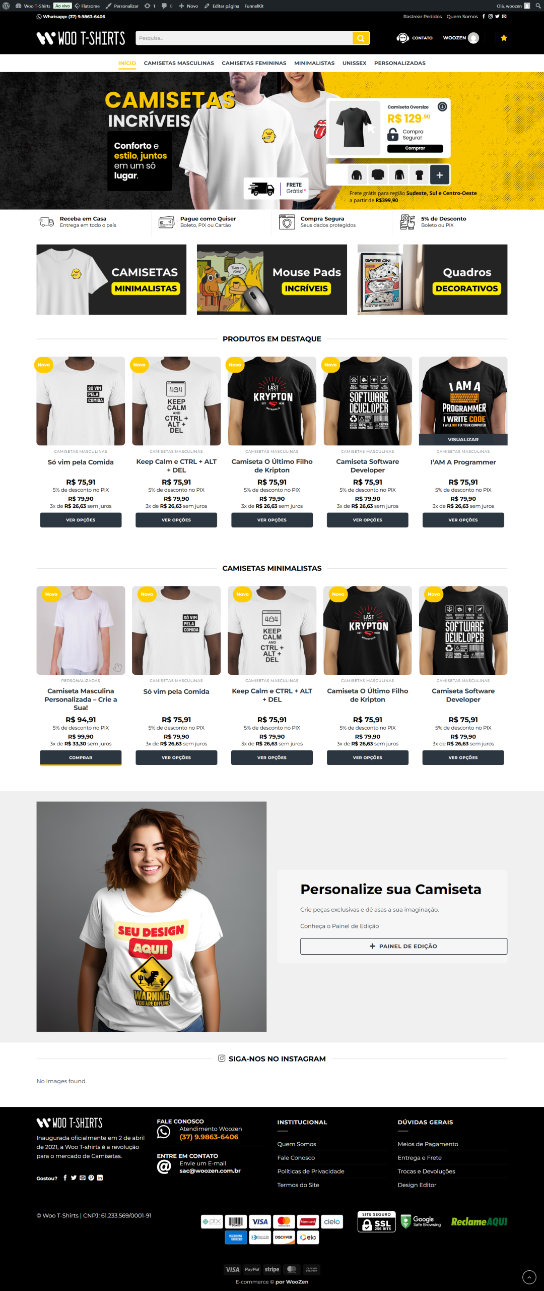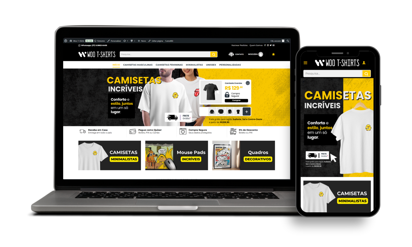 Esqueça as lojas virtuais comuns onde o cliente apenas escolhe o tamanho P, M ou G. Com a Loja de Camisetas Woozen, você entrega uma experiência completa de estamparia digital. Entregamos a estrutura pronta com um Poderoso Personalizador de Produtos integrado.
